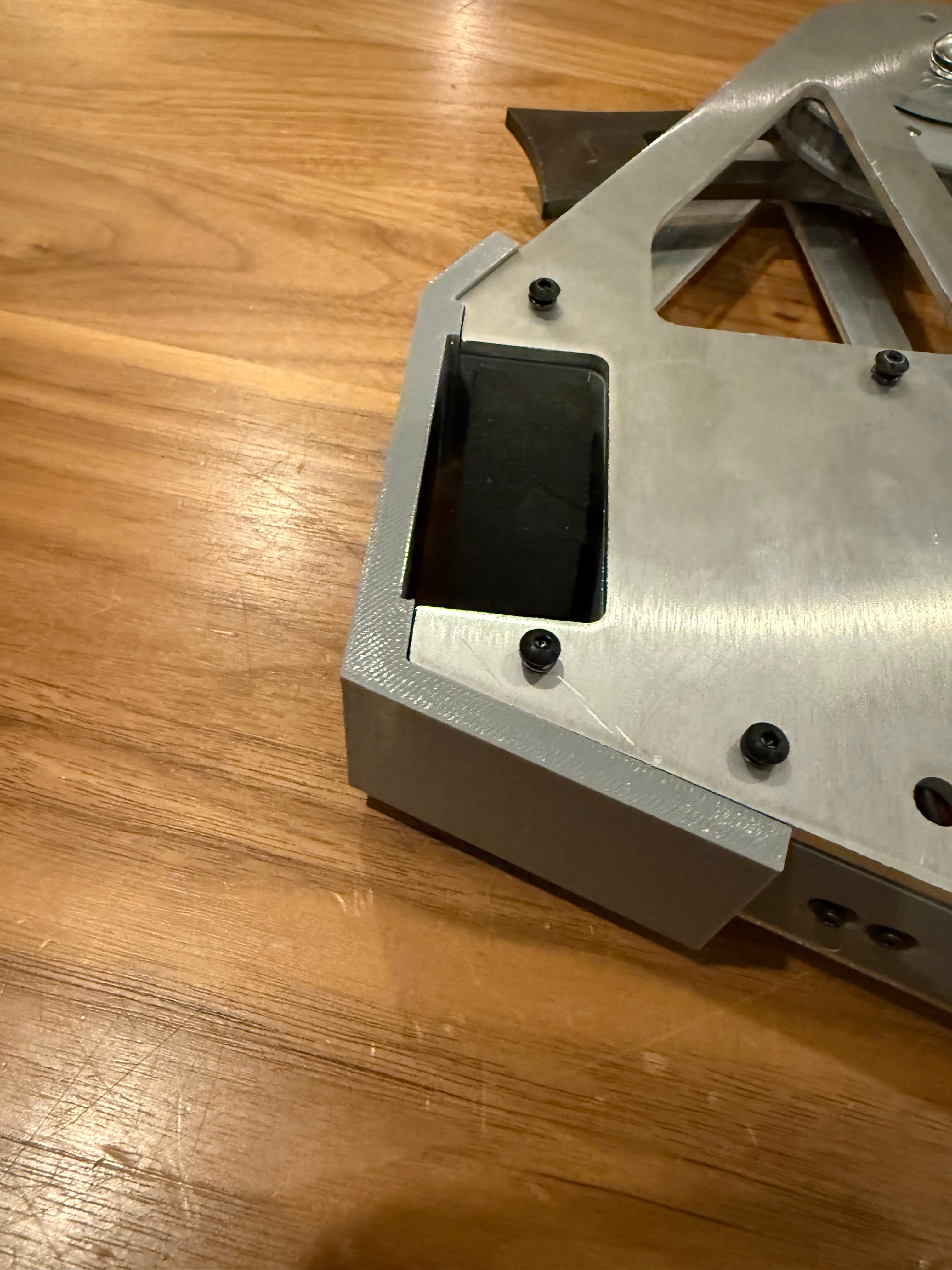 Change the metal plate guarding wheels to a 3d printed “bumper” that wraps further around the bot offering superior protection. We found the metal plate to be a liability, with any hits on the metal plate causes the plate to bend on the motor axel, seizing that wheel. The bumper also wraps further around offering protection to more of the bot.