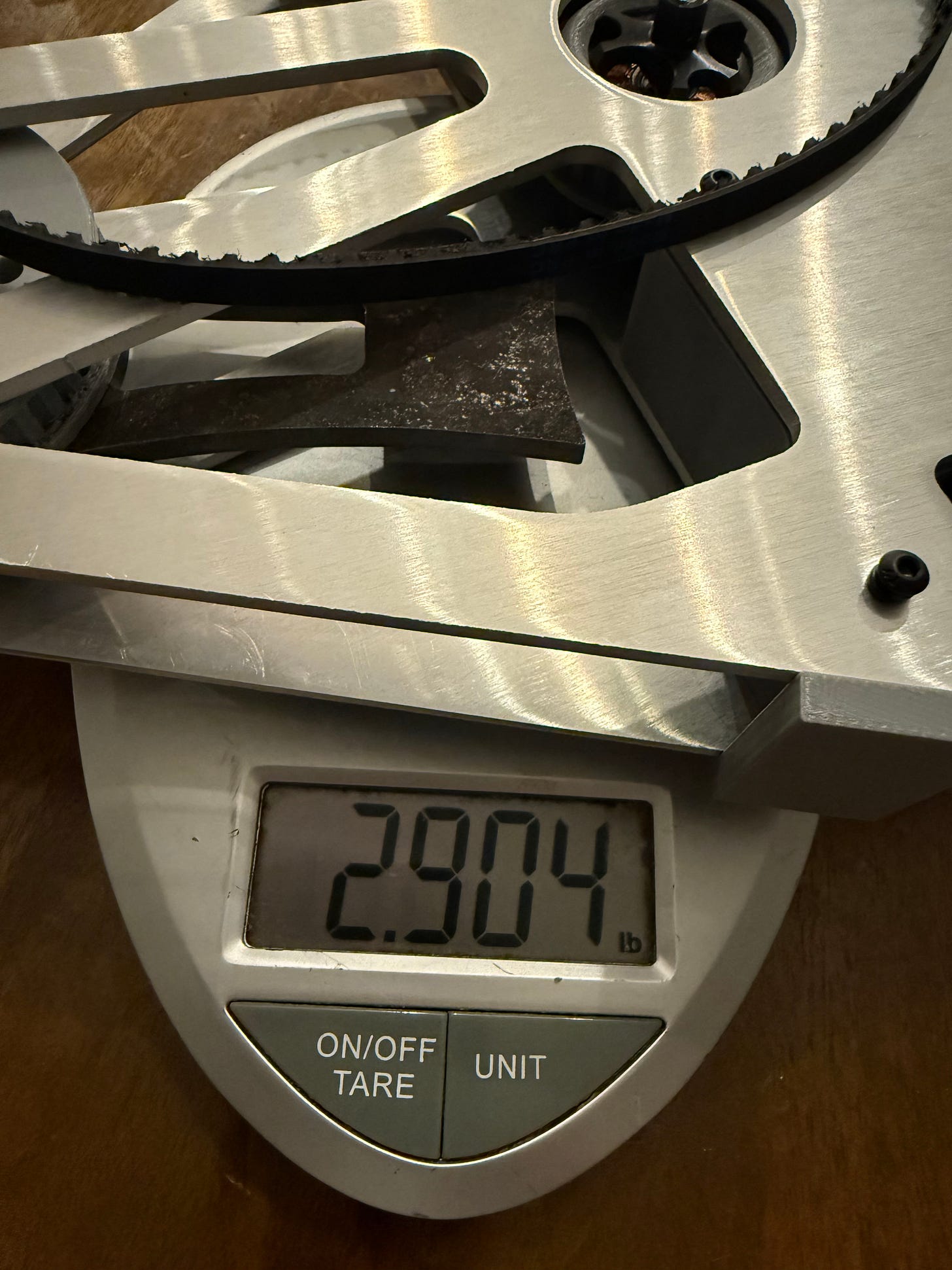 Lightened weapon to save weight for strengthen bot. The old weapon weighs in at about 315 grams. The revised model takes some weight from near the hub and reduces weight to a more manageable 260 grams. This was needed to allow for the heavier drive motors, thicker top and bottom plates, and the added weight of the bumpers.