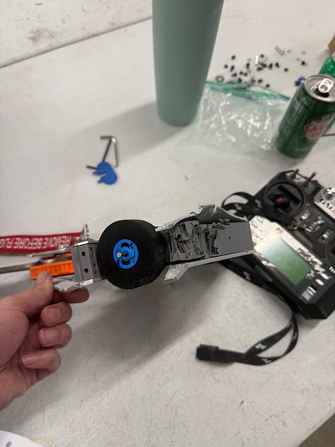 We learned in safety check we didn’t have the failsafe set. Thankfully it only took a few minutes to program on the transmitter. We also learned the weak points of our bot and already made some design improvements. Which is good, because we are competing at NHRL in the November competition!